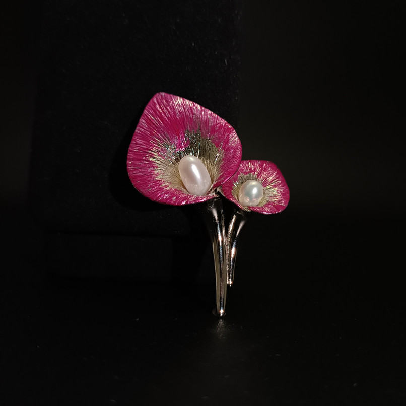 The petals feature a unique hand-painted metallic texture in a striking fuchsia pink with delicate silver accents. This process provides a captivating, finely textured sheen over the metal.