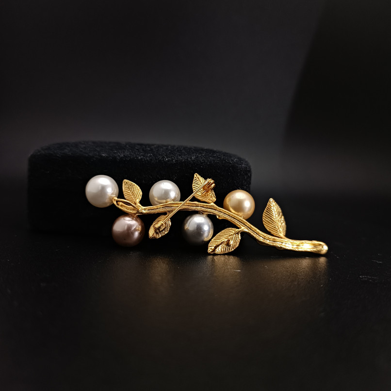 At the heart of this piece are five hand-selected natural freshwater pearls, each boasting a unique, lustrous hue—from creamy whites and soft pinks to sophisticated greys and warm champagne gold. This multi-tonal palette ensures the brooch complements a wide range of outfits.