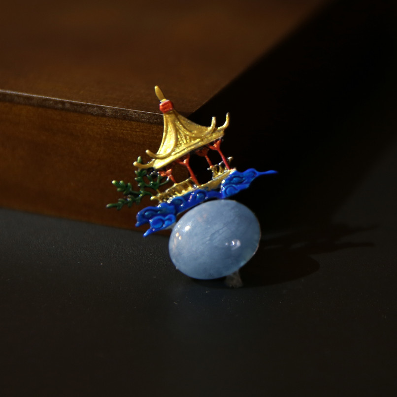 Inspired by the ethereal beauty of ancient Oriental landscapes, this exquisite brooch features a golden pagoda perched atop a magnificent, translucent Natural Aquamarine.
