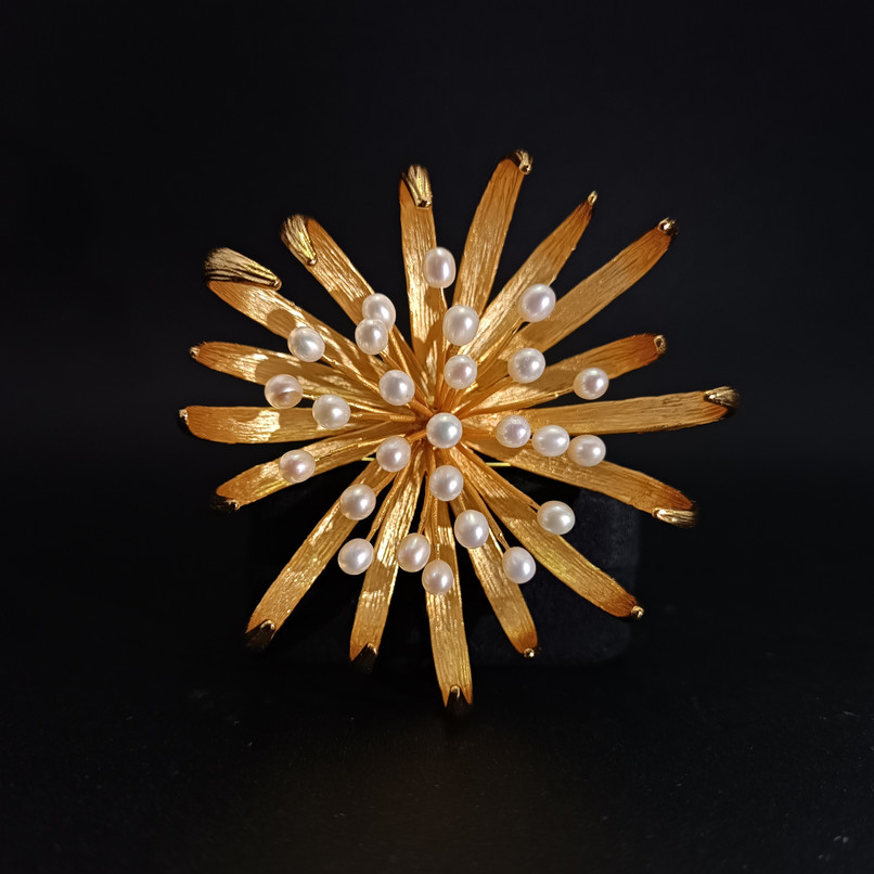 Inspired by the celestial beauty of a starburst and the intricate layers of a blooming chrysanthemum, this brooch is a celebration of light and texture. Each "petal" is meticulously crafted from eco-friendly copper, featuring a fine brushed-gold finish that captures and reflects light from every angle.